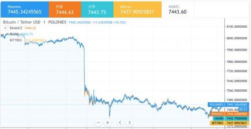而此时正值比特币暴跌,根据Tradingview平台数据显示,比特币自10月21日开始近两日在8200美元横盘整理之后,昨日凌晨3点开始持续震荡下跌,继昨日午间11点20分左右跌破8000美元后,币价小幅反弹,昨日晚间20点25分开始出现直线下跌,短时跌破7600美元后,失守7500美元关口。今日比特币价格主要在7400—7500美元价格区间内波动,期间有3次跌破9400美元后小幅反弹,截止发稿,暂报7445.3美元。
