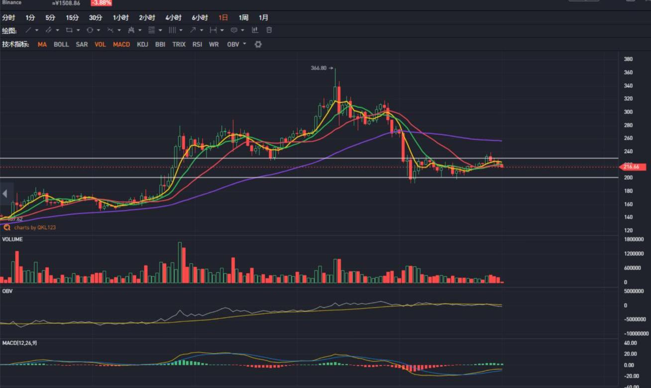 昨日ETH走势偏弱,小幅上攻未触及230美元之后快速下跌,短时在216美元附近获得支撑。ETH/BTC交易对屡创新低,从昨日低点0.0188BTC下行至新低0.0181BTC,并无量能的释放,短时继续探底。