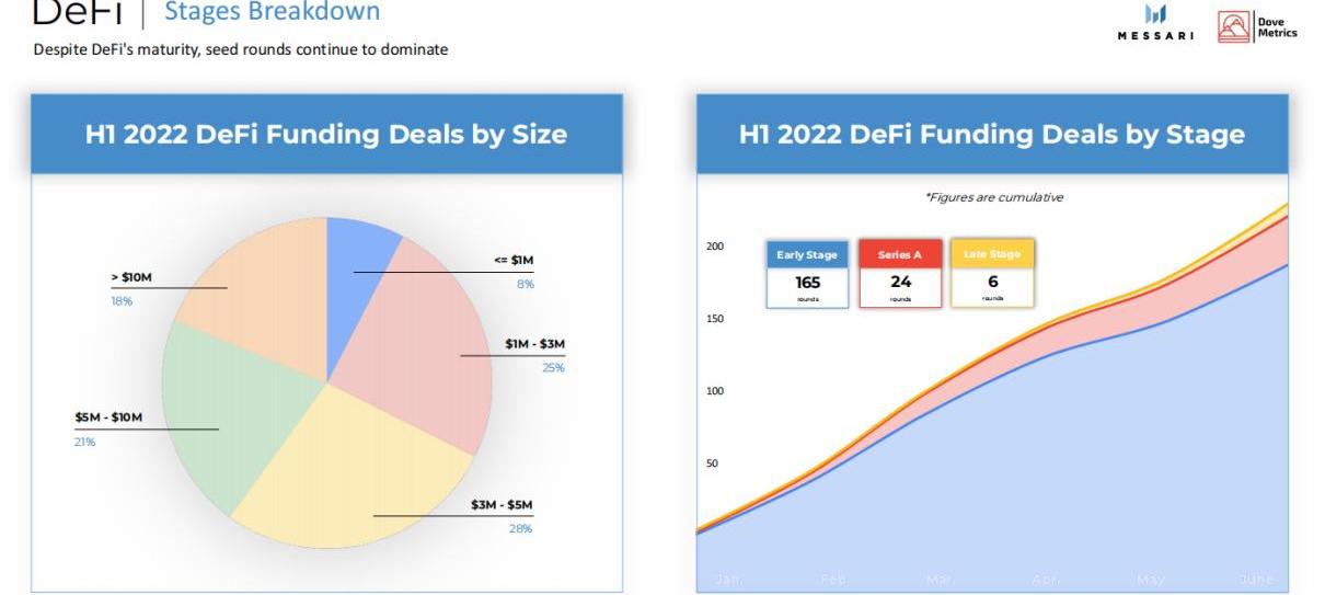 加密研究机构Messari近日发布了与DoveMetrics团队联合推出的2022年上半年加密融资报告。这份报告统计了上半年在Web3、DeFi、CeFi、基础设施和NFT的总计1199起投融资事件,以及包括机构基金、DAO、天使投资人等在内的4300多个活跃的加密投资方。