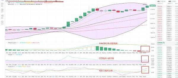 四小时图看;币价在触及上轨位置附近受到承压,目前币价在23950位置附近运行,目前布林带呈缩口姿态运行,各均线多头排列,附图指标整体是多头趋势,整体来看,大趋势我们依旧看多,但也要注意币价小回调,凌晨操作策略以回调做多为主