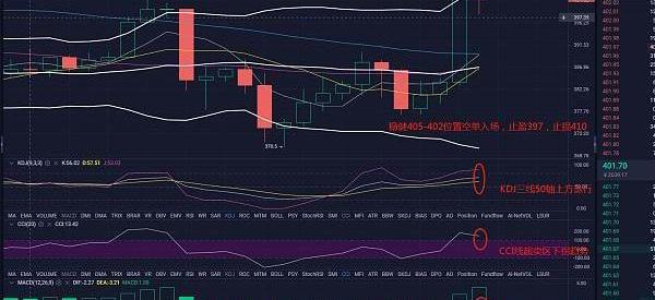 从4小时图来看,目前价格401置附近波动,MACD绿色动量持续放量,KDJ三线指标目前处于50轴上方运行,CCII超卖区下拐趋势,由此可见短期走势还是一个震荡行情,操作上建议高空低多。操作上建议高空低多。策略每天全网公开,实盘操作,现价报单,简单粗暴,时刻跟紧,及时抓空补仓,历史现单可查