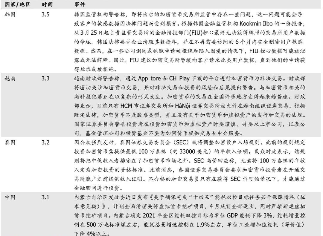 韩国:韩国监管机构:新加密法规或威胁用户数据安全。韩国监管机构警告称,即将出台的加密货币交易所监管中存在一些问题,这一问题可能会导致客户的敏感数据因法律问题而受到损害。根据韩国金融监管机构KookminIlbo的一份报告,从3月25日起负责监管交易所的金融情报部门(FIU)担心最终无法获得牌照的交易所用户数据的命运。韩国法律要求企业清理其数据库,并在不再需要访问的6个月内安全删除用户敏感数据。然而,在一些公司倒闭或执照申请被拒绝后陷入困境的情况下,FIU担心数据可能被泄露或无法解释。因此,FIU建议加密交易所暂缓向客户请求此类用户数据,直到他们的申请获得批准或被拒绝。泰国:泰国证券交易委员会或将调整加密散户入场规则。因公众强烈反对,泰国证券交易委员会或将调整加密散户入场规则。此前的规则规定投资加密货币需提供最低100万泰铢的年收入证明。民众对此表示,该规则将把中低收入者排除在了加密货币市场之外。SEC高管回应称,无意将100万泰铢的年收入定为加密投资的资格标准。此前消息,泰国证券交易委员会要求加密货币投资者在开通交易所账户之前提供收入证明。不合格的加密交易员只有在获得SEC许可的情况下,才能通过金融顾问进行投资。中国:内蒙古计划4月底前关停所有虚拟货币挖矿项目,确保完成能耗目标。内蒙古自治区发改委近日发布《关于确保完成“十四五”能耗双控目标任务若干保障措施》,计划全面清理关停虚拟货币挖矿项目,4月底前全部退出,同时严禁新建虚拟货币挖矿项目。内蒙古确定2021年全区能耗双控目标为单位GDP能耗下降3%,能耗增量控制在500万吨标准煤左右,能耗总量增速控制在1.9%左右,单位工业增加值能耗下降4%以上。