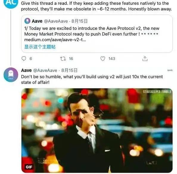 今年12月初,AaveV2正式上线。相比于V1,V2在很多方面进行了改进,比如对Gas的优化。不仅如此,V2还上线了很多新功能,比如收益和抵押品互换、用抵押品还款等等。在AaveV2中,最值得关注的两个新功能是:闪电贷批处理,以及债务代币化。1、闪电贷批处理在AaveV1中,闪电贷借款人一次只能借到一种Token。根据官方的介绍,在AaveV2上,闪电贷批处理允许开发者在同一笔交易内使用多个加密资产执行闪电贷,这意味着闪电贷借款人几乎可以获得所有协议的流动性。2、债务代币化在AaveV2中,用户的债务将被代币化,因此借款人将收到代表其债务的Token。YFI创始人AndreCronje在评价AaveV2时,赞叹道:如果Aave持续不断地在协议中加入这些功能,6~12个月之后,它将会让我感觉自己落伍了。老实说,我被吓到了。对此,Aave的官方推特回复道:别这么谦虚,你用AaveV2打造的东西只是目前状况的10倍而已!