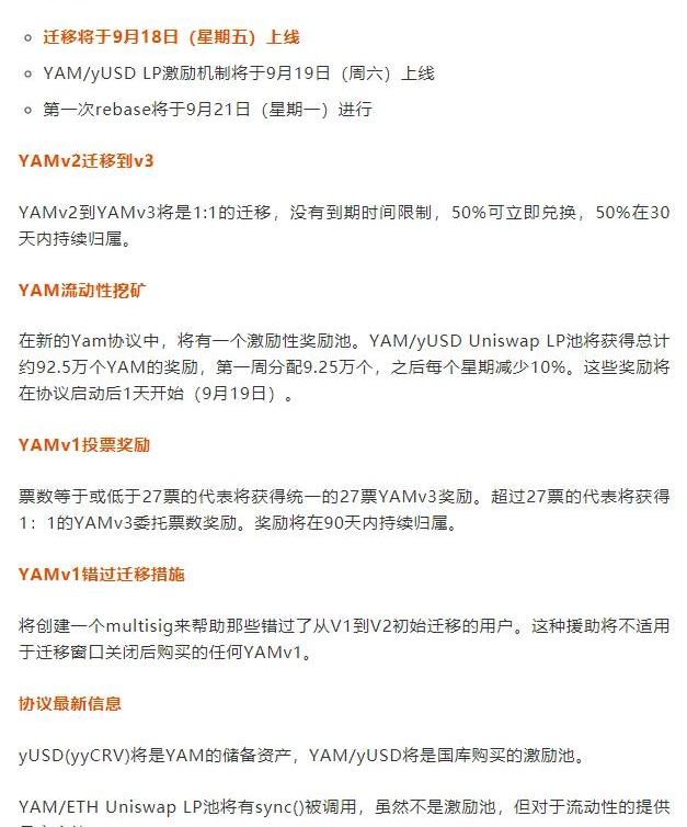 今天凌晨,YAM发布信息YAMv3经过了完整审计,问题已基本处理完毕,将于9月18日上线迁移。comp开启了DeFi的流动性挖矿,让DeFi出圈,走向更多人的视野。而YAM重新定义了流动性挖矿的玩法,让流动性挖矿模式变的更加容易复制。现在看到的寿司、月亮、珍珠、砖石等等挖矿,都是来自于YAM的模仿,连页面风格都类似。YAM上线36小时经历了疯狂到谷底,在慢慢起来,这过程中建立了一个强大的红薯社区。如今红薯马上归来,又会带来什么呢?很值得期待。关于红薯上线迁移的信息,这里贴一张“侠客张”翻译整理的重要信息。