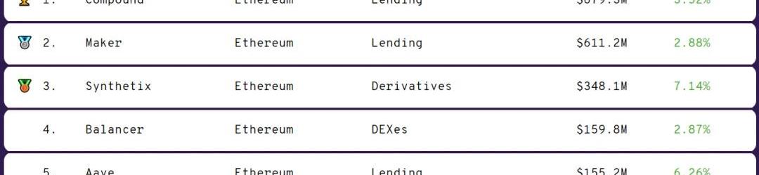 DeFi项目的锁定资金池状况从2019年开始,DeFi的资金规模和使用的人数就不断稳步上升。目前DeFi锁仓资金池的前三名分别是Compound、Maker和Sythetix。原本长期高居第一的Maker锁仓的资金池被后续利用COMP作为激励的Compound快速超越。虽然这些资金池的资金稳步上涨,但背后却存在着问题。