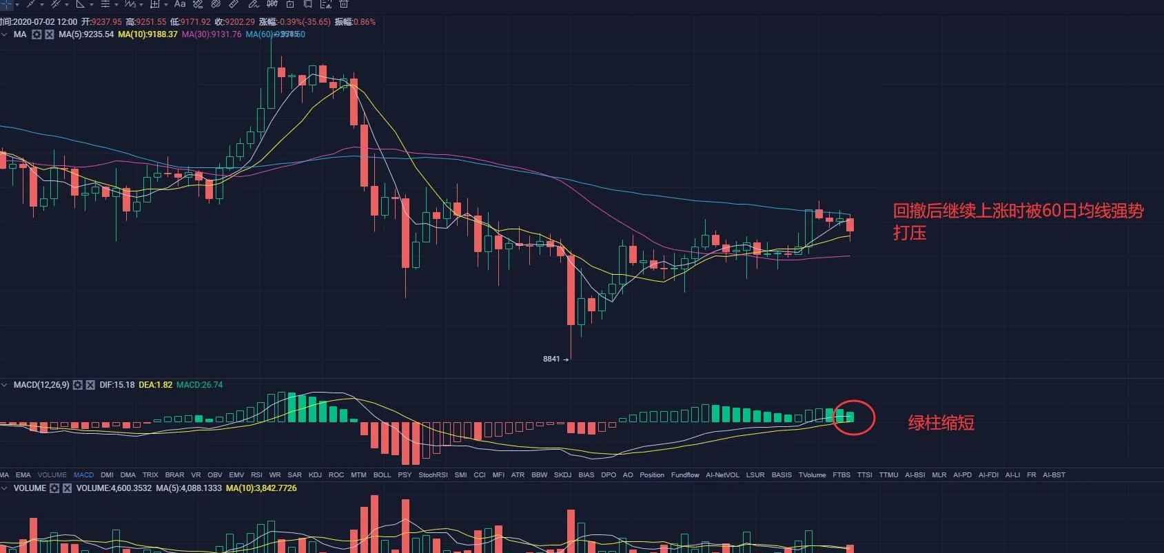 当然,该两个项目的代币之所以如此受追捧也不是投资者硬捧,还是因为其项目本身对参与者的吸引力。Compound主要是借贷项目,其分发奖励机制是“借贷即挖矿”,即只要在Compound上参与借贷,就可以获得COMP。而Balancer的机制是“流动性挖矿”,用户在平台上存入数字资产,为平台提供流动性,就可以获得BAL作为挖矿奖励。Balancer锁仓量最近一月内涨了10倍有余,已经成为了第一大去中心化交易所。像当年的1C0一样,当头部项目发币受到热捧时,其他项目方闻到肉香了也会争先参与,相信接下来其他DeFi项目方也会陆续加入发币大军,甚至也会有投资人涌入DeFi上踊跃开发项目,为了发币。和1C0不同的是,当初1C0拿着本白皮书,靠嘴皮子就能把项目建起来圈钱,而DeFi上的项目只能是先做产品、再发币,所以可以先看产品受众度欢迎度如何再决定是否投资。真正有价值的永远只是头部几个项目,其他的项目更多的只是想凑热闹分一杯羹,泡沫肯定是存在的,包括现在几个发币的项目Compound和Balancer,其本身确实是相当不错的区块链金融项目,但其代币价格也混杂了当前市场过度炒作的因素,特别是在比特币市场没热点的时候,市场内的资金和关注度都疯狂涌向来之不易的热点,当热情退却后才能看清楚其本来面目。而且,现在国内三大交易所中的两大交易所均已上线了该两项目代币交易,必然还会出现其他加密货币的那套—操盘控盘割韭菜的情况,后期可能会再度变成资本游戏,所以在看不清楚的时候最好还是不要参与,宁愿去关注其他还未发币但有潜力的项目,无论是再有耐心沉浸于开发的好项目,看到发币后的热度后也难以抵抗这份诱惑,总会有值得大家去发现的。回到行情上,昨晚比特币冲击9300美元失败回落,当前已经将近回到了昨日上涨前的位置,目前还是努力争取站在9200美元上方。当前周线级别MACD绿柱依然持续缩短中,而本周K线暂时还是呈阳的,但每周开始的时候便上涨总是让人不太放心,后续还有好几个交易日需要对行情的反扑担惊受怕。