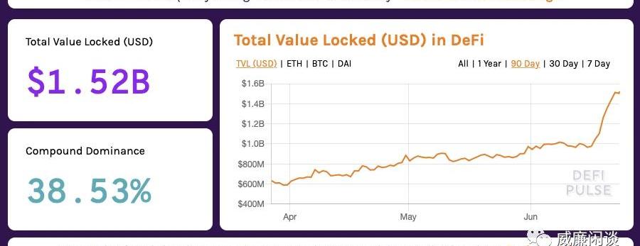 编者按:本文来自威廉闲谈,作者:陳威廉,Odaily星球日报经授权转载。“以太现在的主要矛盾是日益增涨的合约使用需求,与停滞不前的底层能力之间的矛盾。”--一位不愿意透露姓名的ETH大户如果到了2020年都快下半年了,你还认为加密货币没有实用性,没有真正的落地价值,甚至觉得没有人在用都在炒作的话,那么你就太太太落后了。现在以太坊上最热闹的DeFi生态,参与资金规模已经到了15亿美元了: