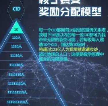 尽管CXC将自己包装成下一代公链,但它仍然难掩本质。“CXC刚出来时,币圈很多人开玩笑说,这个项目把CX二字写在名字里,真是赤裸。”白永年说。在入金模式上,CXC借鉴了当时火热的共振币VDS。投资者可以将比特币转到“共振池”参与“对撞”,获得CXC。在共振模式中,比特币与CXC的兑换比例不是固定的,越早投资,兑换比越高。毫无疑问,在这种模式下,所有玩家都成为了击鼓传花的参与者。与绝大多数资金盘相同,CXC也有着静态与动态的双重收益模式。投资者持有更多的CXC,或者为CXC拉来了更多的人头,都会提升“算力”,获得更多的收益。CXC的静态收益,被称作“持币算力”,持币就能获得。其收益比例会随着CXC市面流通量等指标动态调整。“早期,CXC这部分收益的年化在6000%以上。后来玩CXC的人多了,收益也下降了,但月息还能有20%左右。”白永年表示。要想加入CXC,新玩家必须填写老玩家的邀请码,并消耗10个CXC购买CXC体系内的唯一个人编号“CID”,获得入场资格。有趣的是,新人支付的10个CXC,有5个会直接转给邀请人;另外4.5个CXC会转给邀请人之上的另外9个上线,即每人0.5CXC;最后0.5个CXC将作为“公链维护费”,上交项目方。这意味着,CXC的返佣层级高达10级。这是一个赤裸裸的资金盘。对于这一模式,CXC也给出了极具蛊惑性的文案:“若我塔下10级每级每人邀请10个CID,到达第10级时,将有超过123亿人为我贡献邀请收益,超过地球总人口。”