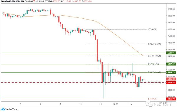 BTC在最近一段时间的弱势震荡过程中并没有能够完成对5430-5930这一阻力密集区域的反弹收复,4小时50周期均线的持续下压正在快速蚕食BTC上方的“活动空间”,目前4小时50周期均线已经下探至上一轮下跌波段反抽0.618黄金分割阻力所在的6400整数关口附近,一旦该均线向下刺穿这一阻力位置,那么5930附近的阻力强度将得以进一步提升。