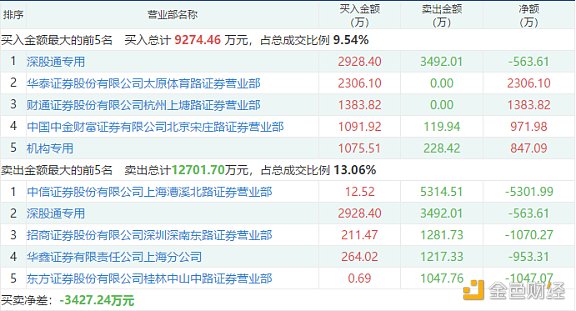 飞天诚信盘后公布的一日榜数据显示,龙虎榜资金净卖出超3400万元。买一和卖二均为深股通专用席位,买入超2900万元的同时卖出近3500万元。买二一线游资扫货超2300万元,卖一中信证券上海漕溪北路营业部大笔卖出超5300万元。
