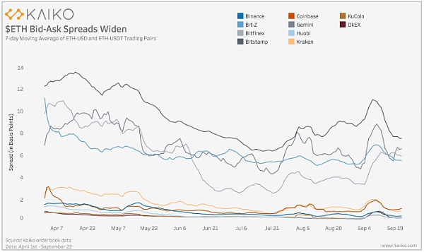 最近去中心化金融(DeFi)的发展展示了以太坊作为先进的点对点金融系统的基础设施的潜力。在过去的几个月里,这对该资产的流动性有何影响?最近的关注点大多集中在ETH在Uniswap等去中心化交易所上的作用,但通过研究中心化交易所的流动性,我们可以更好地了解专业做市商是如何应对过去一个月的价格变动的。