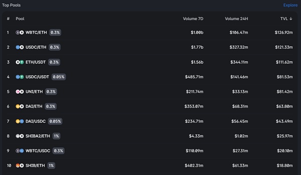 上图:Uniswap V3 上各个交易对的7天交易量、24小时交易量和 TVL 数据。图源:Uniswap Analytics