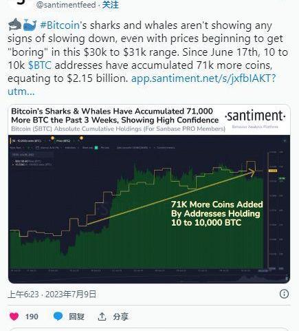 区块链数据跟踪器Sentiment周日报告称,自7月17日以来,持有10至10,000个比特币的地址已额外积累了71,000个比特币,相当于近21.5亿美元。