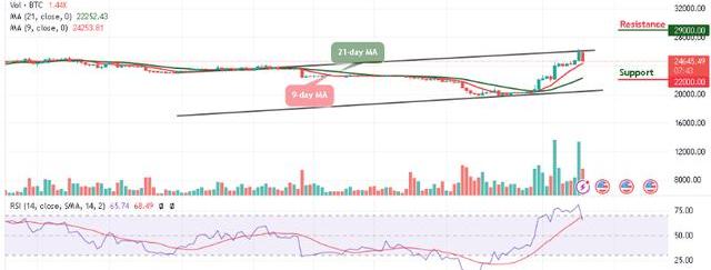 在撰写本文时,BTC/USD在从盘中高点26,379美元的阻力位调整后,以24,399美元易手。此外,如果价格跌破9天和21天移动平均线,比特币价格可能容易遭受损失。