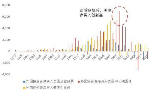 以长期国债为代表的政府和企业债券,相当于全世界借钱给美国。美元始终是全球最重要的外汇储备币种,这些美元储备中的很大一部分转化成了美国长期国债。这也是美国能够在财政出现长期赤字的情况下,美元仍然没有出现明显贬值的原因。尤其是次贷危机后,美国长期国债净买入创新高,再次印证了美债的避险功能。