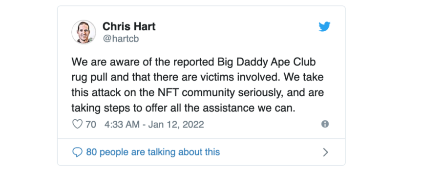 推文内容:我们已经了解到 Big Daday Ape Club 跑路并有人蒙受损失一事。我们高度重视这次针对 NFT 社区的攻击,正在采取措施尽可能地提供所有协助。