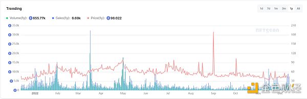 一个项目的流动性好不好、交易成本高不高、热度变化是否剧烈,这些在交易数据上便得到很好地体现,参与人数增多,而交易量也会相继增长。数据显示,尽管 2022 年是加密货币的寒冬,但 BAYC 的交易并没有停滞不前。
