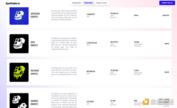 第一个池是「ApeCoin 池」。该矿池不要求用户持有 NFT,任何 APE 代币持有者都可以向该矿池存入尽可能多的 APE 代币。