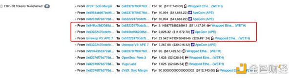 很快,该套利模式就被成功复制。一套利者同样从 dYdX 平台以闪电贷的方式借出 90 枚 ETH,并购入 BAYC #1633 ,同时获得了该 NFT 下质押的 10, 000 枚 APE;套利者后又将所得 APE 分批兑换为约 9.1 枚 ETH 和 23.54 枚 ETH,共计 32.68 枚 ETH,然后将 BAYC #1633 以 65 ETH 价格出售,净赚约 7 ETH。