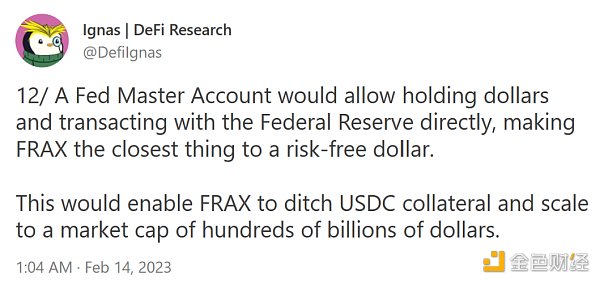 Frax Finance 的目标是通过申请美联储主账户(FMA),以尽可能接近美联储(Foresight News 注,美联储主账户允许持有美元并直接与美联储进行交易),从而摆脱将 USDC 作为抵押品的局限以及银行倒闭的风险,并将市值扩大到数千亿美元,使 FRAX 成为最接近无风险美元的东西。