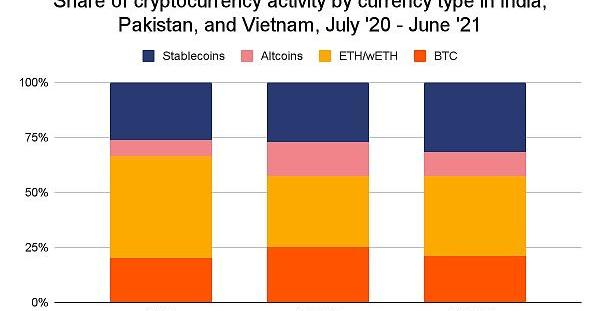 当我们查看按加密资产划分的交易价值细分时,也会出现有趣的差异。例如,我们看到以太坊和wETH在印度活动中所占的份额大于越南或巴基斯坦。