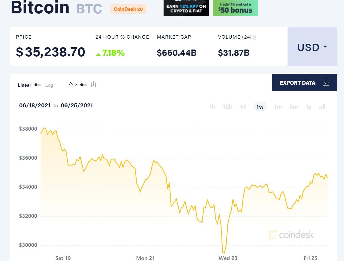 截至发稿,比特币价格24小时涨幅7.18%,报35238.70美元/枚,已较4月中旬创下的历史高点近乎腰斩。