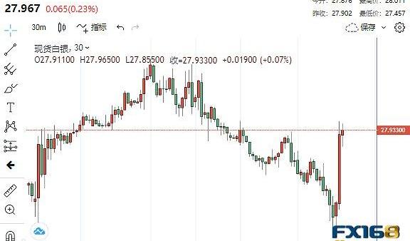 现货白银一度触及27.457美元/盎司低点,但随后自低位大幅上涨至27.967美元/盎司,日内由跌转涨。