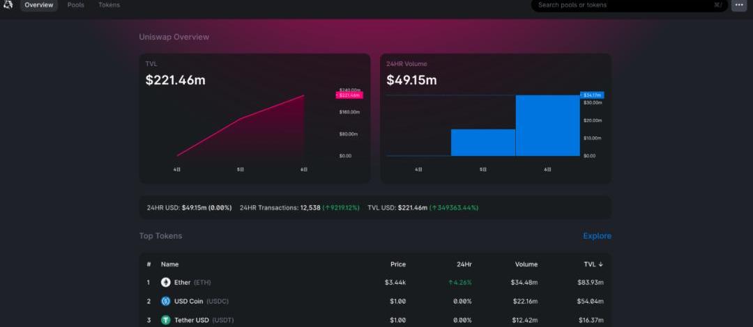 Uniswap.info一直都是官方推出的数据统计站点,可以查看TVL、交易量、交易趋势等数据。目前来看V3的Info站点的首页改动并不大,主要聚焦在较小的设计调整。