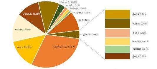 那么,以太坊上数量如此可观的比特币都去了哪些地方?以数量最多的WBTC为例,在其目前105132的总供应量中,前15个地址持有超过90%,并且主要都是头部的DeFi平台,前5地址分别是:UniswapV2、Aave、Maker、Curve和Compound。这点说明比特币在DeFi领域已经有大量的借贷,交易或转账需求。
