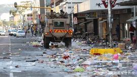 南非街头,军方人员在巡逻。南非总统府代理部长昆布佐·恩特沙韦尼15日说,因前总统祖马被捕入狱引发的骚乱已造成117人死亡.